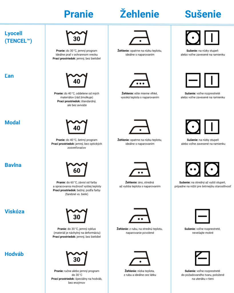 Bavlna zvládne 30 °C až 60 °C, bežné sušenie v sušičke aj žehlenie na vyššiu teplotu. Viskózu vždy perte naruby maximálne na 30 °C, sušte naplocho mimo sušičku a žehlite mierne vlhkú na strednú teplotu. Ľan perte šetrne bez odstreďovania do 40 °C, sušte mimo priame slnko a žehlite ideálne ešte vlhký na vysoký stupeň. Hodváb perte ručne alebo na jemný program do 30 °C, nesušte v sušičke a žehlite naruby na nízku teplotu cez látku.