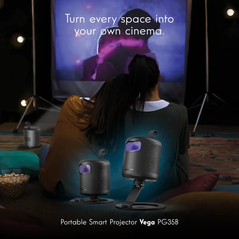 Filmy pod hviezdami. Hranie vo vašej spálni. Netflix na strope. Nové THOMSON projektory — prenosný Vega PG35B a projektor s ultra krátkou projekčnou vzdialenosťou Sirius PG55B — prinášajú filmový zážitok kde vás život povedie. Navrhnuté ako časť THOMSON Go kolekcie sú kompaktné, bezdrôtové a vybavené Google TV, premenia spálne, balkóny, kuchyne alebo záhrady na inteligentné kiná ovládané hlasom.