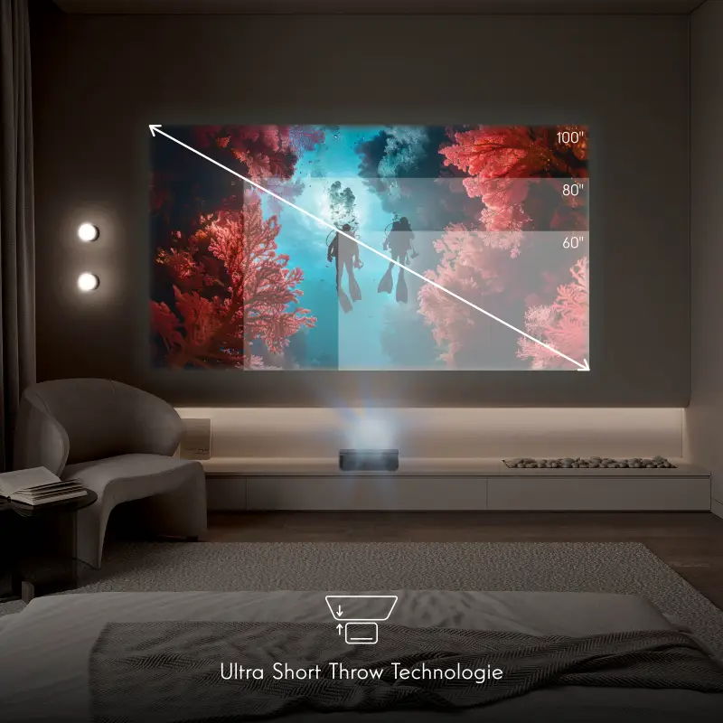 Sirius tvorí domov s veľkou obrazovkou — bez veľkej stopy. Vďaka ultra krátkej laserovej projekčnej vzdialenosti Sirius vytvára úžasný 100-palcový obraz len z diaľky 40 cm. Žiadna montáž na stenu. Žiadne káble. Žiadne presúvanie nábytku.