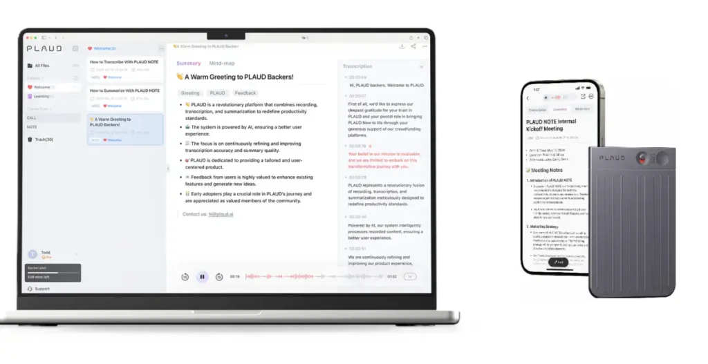 Plaud.ai spája hardvér, softvér a cloudovú AI do jedného asistenta, ktorý dokáže automaticky zaznamenať, prepísať a zhrnúť konverzácie. Používatelia môžu nahrávať v dvoch režimoch (záznam hovorov a okolitého zvuku) a následne získajú zrozumiteľný prepis, AI sumarizáciu a štruktúrované výstupy vo webovej aj mobilnej aplikácii.
