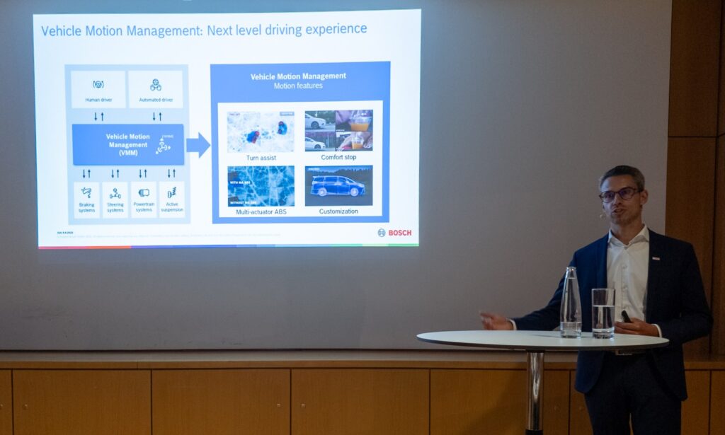 Softvérové riešenie pre dynamiku vozidla: Bosch Vehicle Motion Management preberá úlohu inteligentného riadenia aktuátorov. Toto systémové riešenie dokonale synchronizuje brzdy, riadenie, podvozok a hnaciu jednotku. Vehicle Motion Management je vhodný pre všetky vozidlá a značky v segmente osobných automobilov a posúva zážitok z jazdy na novú úroveň. Vďaka špeciálnej softvérovej funkcii sa vozidlo môže premeniť napríklad na mimoriadne ľahko ovládateľné mestské vozidlo, výkonné športové vozidlo alebo limuzínu s komfortom pre šoféra – podľa aktuálnej nálady konkrétneho vodiča. Aktivovať sa dá buď stlačením tlačidla, alebo prostredníctvom umelej inteligencie, ktorá pracuje v pozadí a vozidlo prispôsobuje individuálnym potrebám.