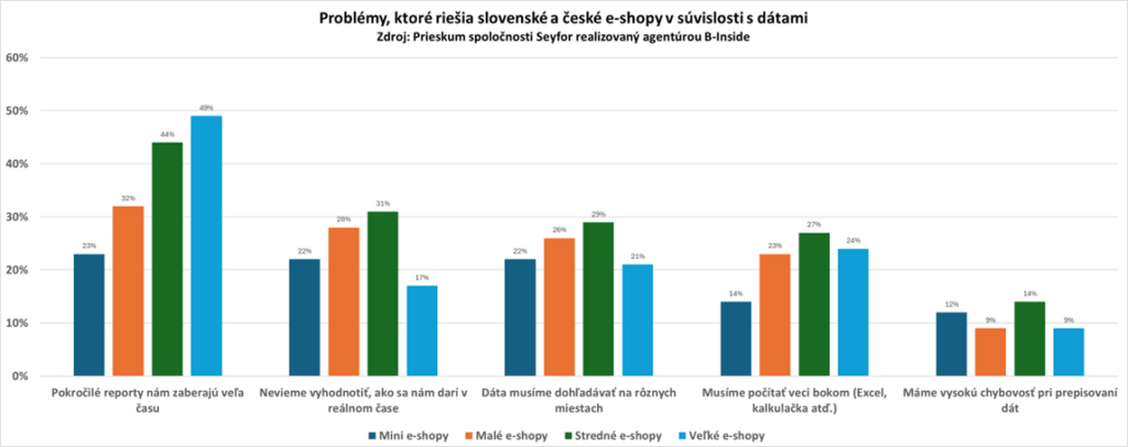 Problémy s prácou s dátami sa pritom neobmedzujú len na reporty – 28 percent malých a 31 percent stredných e‑shopov nedokáže v reálnom čase vyhodnocovať, ako sa im aktuálne darí. Až 29 percent stredných podnikov dohľadáva dáta zložito na rôznych miestach a často nemajú istotu v tom, ako ich správne čítať. U väčších e‑shopov je tento problém typický predovšetkým pre tých, ktorí ERP zatiaľ nevyužívajú. Manuálne výpočty a vyhodnocovanie dát s pomocou Excelu alebo kalkulačky priznáva celkovo 27 percent e‑shopárov a opäť je tu logicky výrazne väčšie zastúpenie tých, ktorí sa spoliehajú na rôzne vzájomne nepreviazané riešenia.