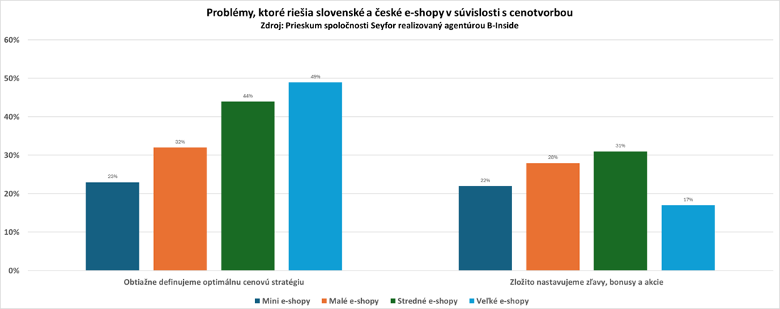 Iba 26 percent e‑shopárov uviedlo, že im nerobí problém nastaviť optimálnu cenovú stratégiu. Naopak, 36 percent respondentov to označilo za veľký alebo stredne veľký problém. Najviac ťažkostí s touto témou majú malé e‑shopy (43 percent) a strední e‑commerce podnikatelia (40 percent). Ale ani veľkí hráči nie sú, prekvapivo, výnimkou – 31 percent z nich priznáva, že optimálnu cenotvorbu riešia obtiažne.