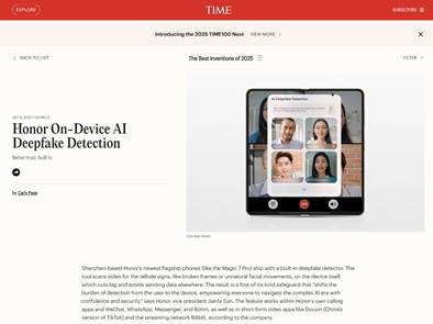 Spoločnosť HONOR bola ocenená v rebríčku TIME Best Inventions 2025, ktorý každoročne vyzdvihuje najvýznamnejšie svetové inovácie. HONOR sa stal jedinou značkou, ktorá tento rok získala dve ocenenia za technologické inovácie v oblasti smartfónov, čo potvrdzuje jeho pozíciu globálneho lídra v inováciách a vývoji AI zariadení.