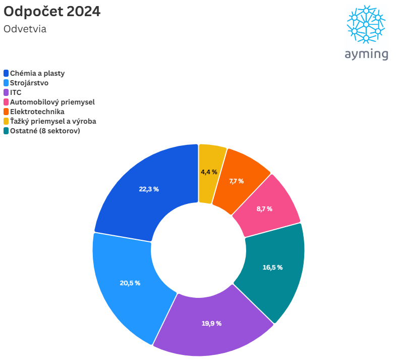 Najviac firiem, ktoré si vlani uplatnili na Slovensku odpočet na výskum a vývoj, podniká v chémii a plastoch (22,3 %), zatiaľ čo 20,5 % spoločností sa zaoberá strojárenstvom, 19,9 % IT biznisom a bezmála 9 % automobilovým priemyslom. Takmer polovica z nich – 43 % – je pritom z Bratislavského kraja.