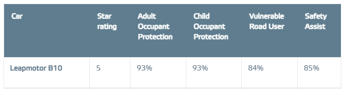 Základom úspechu boli vynikajúce výsledky v dvoch najdôležitejších parametroch: v ochrane dospelých cestujúcich dosiahol Leapmotor B10 najlepšie hodnotenie spomedzi všetkých vozidiel (93%), rovnaké hodnotenie dosiahol aj v ochrane detských cestujúcich (93%).