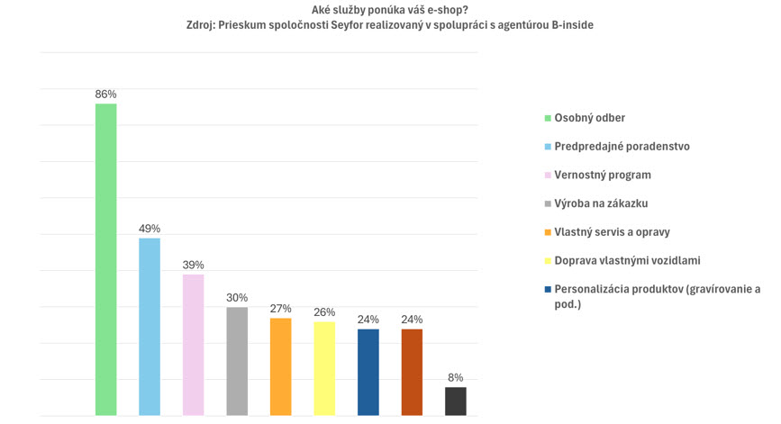 Napriek tomu, že osobný odber sa stal naprieč trhom štandardom, veľa ďalších služieb – od personalizácie produktov až po dopravu vlastnými vozidlami – zostáva doménou iba zhruba štvrtiny predajcov. Ukazuje to prieskum agentúry B-inside realizovaný pre spoločnosť Seyfor medzi prevádzkovateľmi slovenských a českých e-shopov.