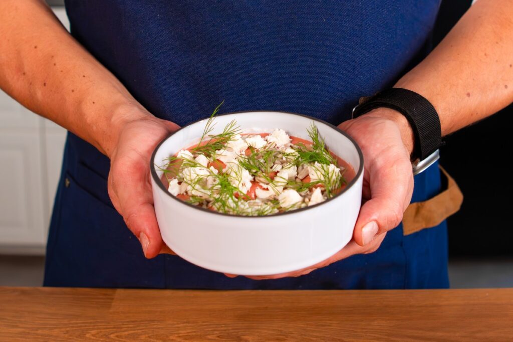 Postup: Cviklu zabaľte do alobalu a pečte v rúre pri teplote 180 °C, kým nezmäkne. Po vychladnutí ju ošúpte a vložte do mixéra. Pridajte cícer, cesnakový olej, sezamovú pastu tahini, citrónovú šťavu a soľ, potom všetko rozmixujte dohladka. Ak je zmes príliš hustá, pridajte trochu nálevu z cíceru, aby hummus získal krémovú konzistenciu. Nakoniec dochuťte soľou podľa potreby. Hotový hummus preložte na tanier, ozdobte rozdrobenou fetou, čerstvým kôprom a opraženými slnečnicovými semienkami.