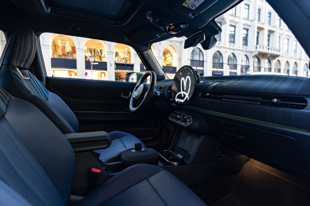Interiér, ktorý je vo všetkých variantoch identický, je vybavený sedadlami v odtieni Nightshade Blue a čiernymi pletenými povrchmi s tónovými pruhovanými vzormi, ktoré vyžarujú nenápadnú britskú eleganciu. Po otvorení dverí vozidla privíta vodiča svetelná projekcia s priateľským pozdravom „Hello“. Toto privítanie dopĺňa centrálny odkaz Paula Smitha „Every day is a new beginning“ (Každý deň je nový začiatok) na prahu dverí. Ďalším kreatívnym prvkom interiéru je textilný pás na 6-hodinovom ramene športového volantu s charakteristickými pruhmi Paula Smitha – charakteristický dizajnový prvok, ktorý podčiarkuje nezameniteľný štýl britského dizajnéra. Ručne kreslená grafika jeho charakteristického znaku „zajaca“ zdobí podlahovú rohož, zdôrazňuje britský zmysel pre humor a štýlovo dopĺňa dizajn interiéru.