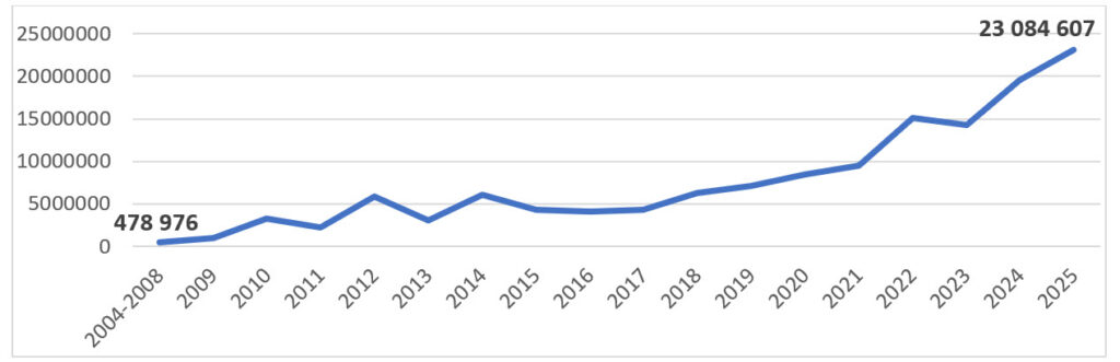 Graf 1: Historický trend vývoja odhalených podvodov od 2004 do 2025 v eur Zdroj: Allianz