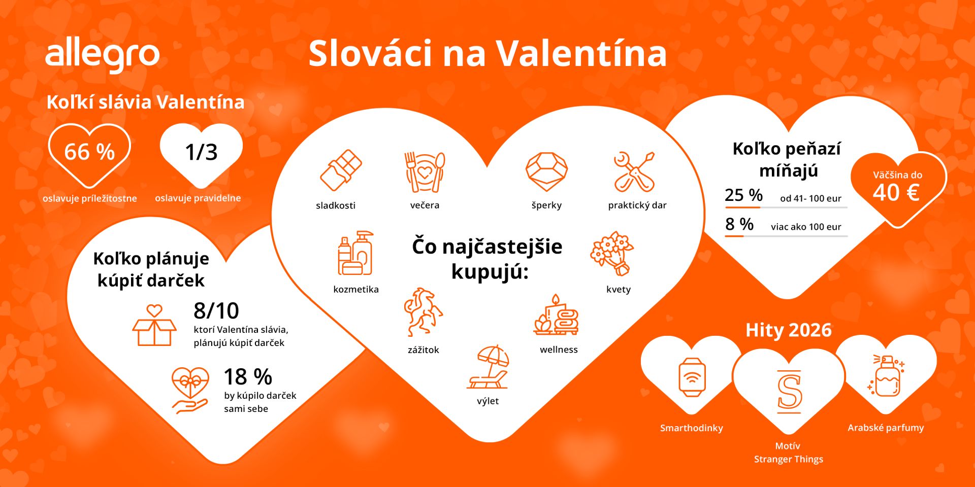 Valentín si na Slovensku pripomína väčšina populácie – 66 % Slovákov ho oslavuje aspoň občas, pričom tretina pravidelne. Až 8 z 10 ľudí, ktorí Valentína slávia, plánuje svojej polovičke kúpiť darček. Najčastejšie pritom siahajú po sladkostiach, kvetoch a praktických daroch podľa záujmov partnera, no významnú úlohu zohrávajú aj kozmetika, zážitky či šperky a hodinky. Vyplýva to z reprezentatívneho prieskumu Perfect Crowd pre Allegro medzi Slovákmi vo veku 18 až 65 rokov.