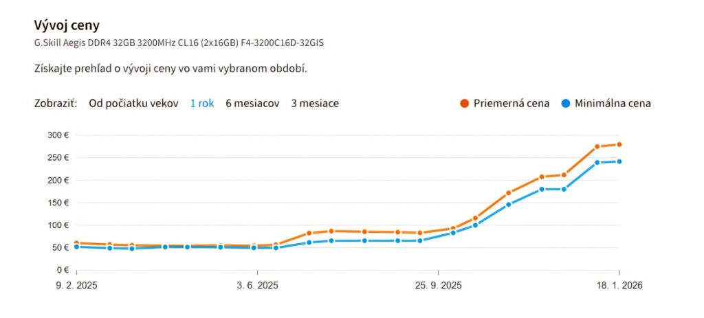 Situácia sa skomplikovala v čase technologickej zmeny, ktorú umelo urýchlila AI horúčka. Staršie pamäte DDR4 (v ponuke od roku 2014) stále tvoria základ väčšiny domácich a firemných PC. Hoci prechod na novší štandard DDR5 začal už pred rokmi a ceny DDR4 stihli klesnúť na svoje historické minimá, v roku 2025 nastal zlom. Výsledkom je paradoxné zdraženie starej technológie: ceny modulov medziročne vzrástli podľa dát Heureky takmer 5-násobne. Najpredávanejšia operačná pamäť DDR4 totiž pred rokom stála zhruba 50 eur, pričom dnes je to vyše 240 eur.