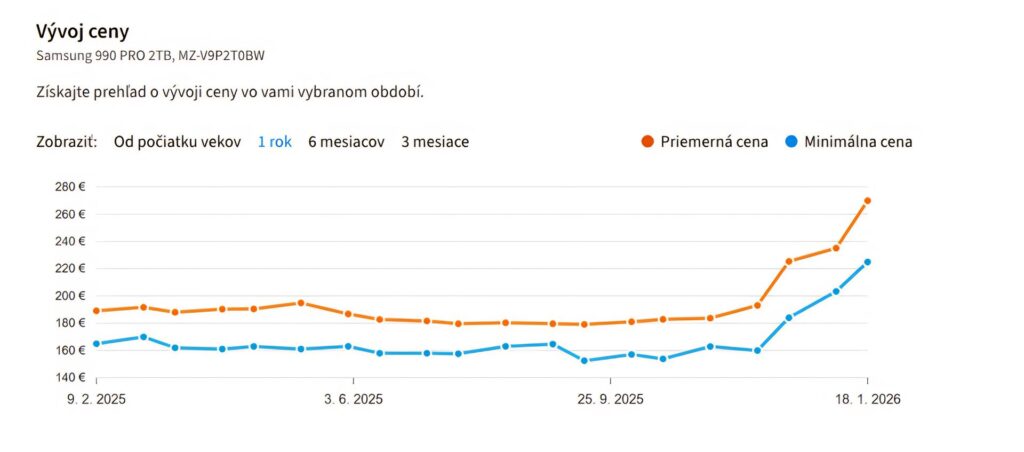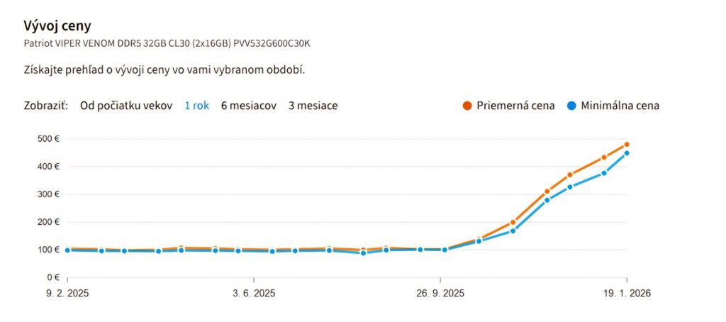 Novšie pamäte DDR5 (v ponuke od roku 2020) už mali byť v roku 2026 lacným a dostupným štandardom. Opak je však pravdou. Problémom nie je len priamy dopyt po DDR5, ale fakt, že fabriky prednostne vyrábajú iné pamäte, ktoré sú kľúčové pre AI akcelerátory. Keďže sa bijú o rovnaké stroje a čas v továrňach, bežné počítačové pamäte sa znova dostali na vedľajšiu koľaj. Kvôli tomuto „priškrteniu“ výroby podľa dát Heureky zdraželi DDR5 kity za posledný rok rovnako 5-násobne. Najpredávanejšia operačná pamäť DDR5 stála pred rokom zhruba 100 eur, pričom dnes je to takmer 500 eur.