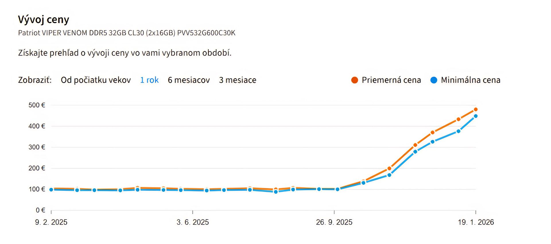 Graf vývoja ceny najpopulárnejšej DDR5 operačnej pamäte:
