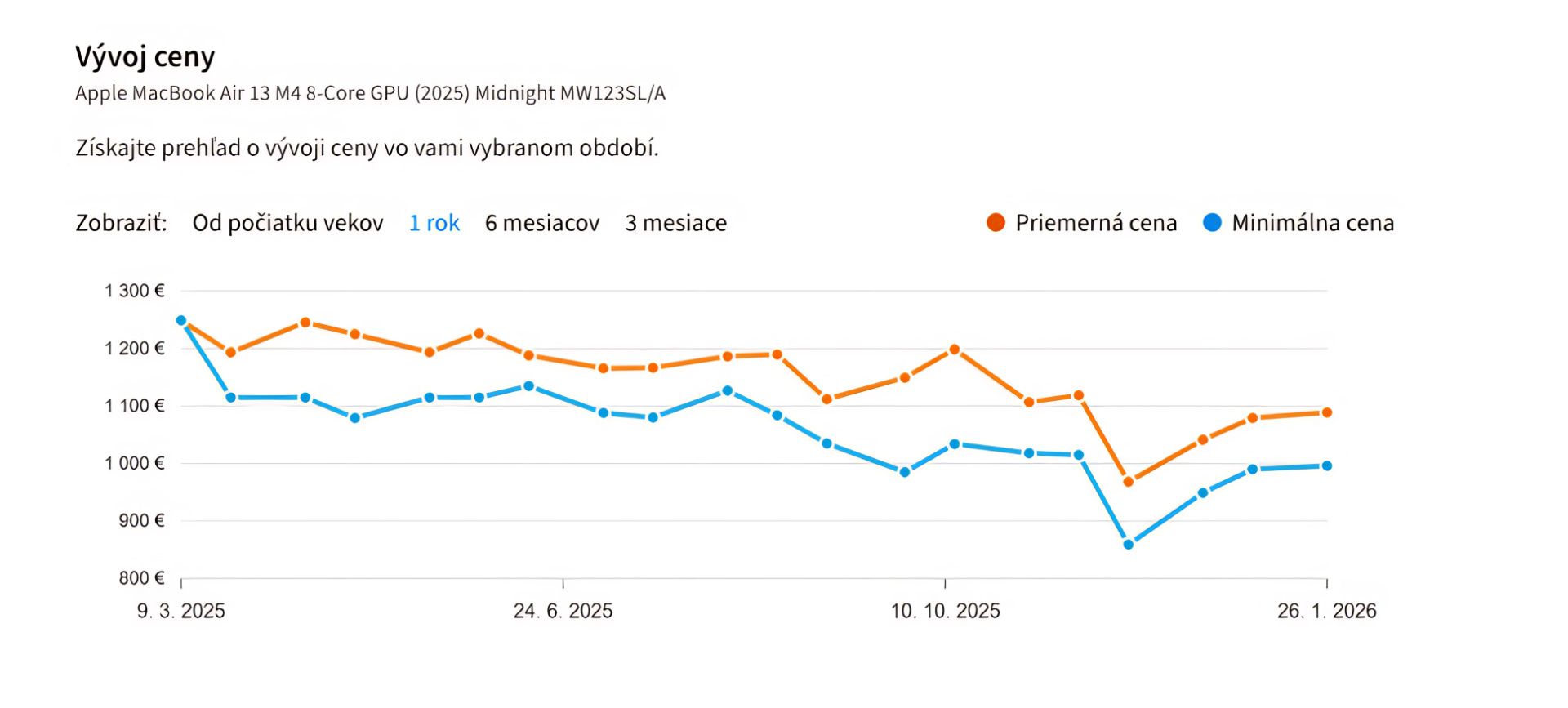Graf vývoja ceny najpopulárnejšieho notebooku – ceny zatiaľ výraznejšie nerastú: