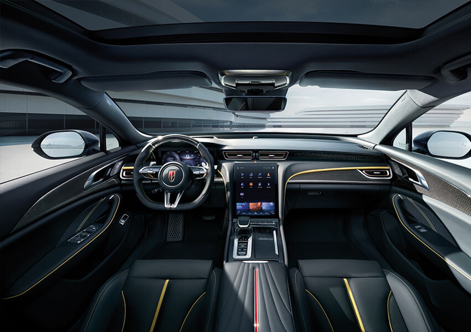 Posádku v interiéri privítajú prémiové materiály a odvážny dizajn sedadiel s farebným lemovaním, ktoré sa prenieslo aj na prístrojovku. Tá má ambientné osvetlenie a rozmerný stredový tunel, na ktorom sedí aj obrovský na výšku orientovaný centrálny displej infotainmentu.
