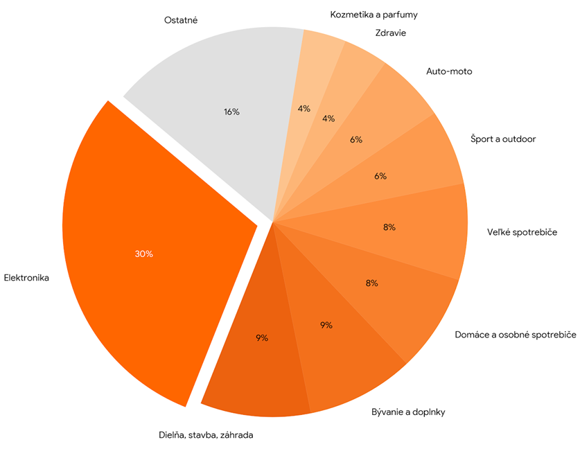 Pri pohľade na to, kam smerujú peniaze slovenských spotrebiteľov v online priestore, je jasným lídrom Elektronika. Z celkového objemu tržieb (GMV) si táto kategória ukrajuje najväčší podiel, a to 30,1 %. Silný záujem je aj o zveľaďovanie domova. Druhou najsilnejšou kategóriou je totiž Dielňa, stavba, záhrada (9,16 %), tesne nasledovaná Bývaním a doplnkami (8,92 %). Významnú časť slovenského e-commerce tvoria aj nákupy bielych spotrebičov – Domáce a osobné spotrebiče predstavujú 8,14 % a Veľké spotrebiče 7,99 % trhu.